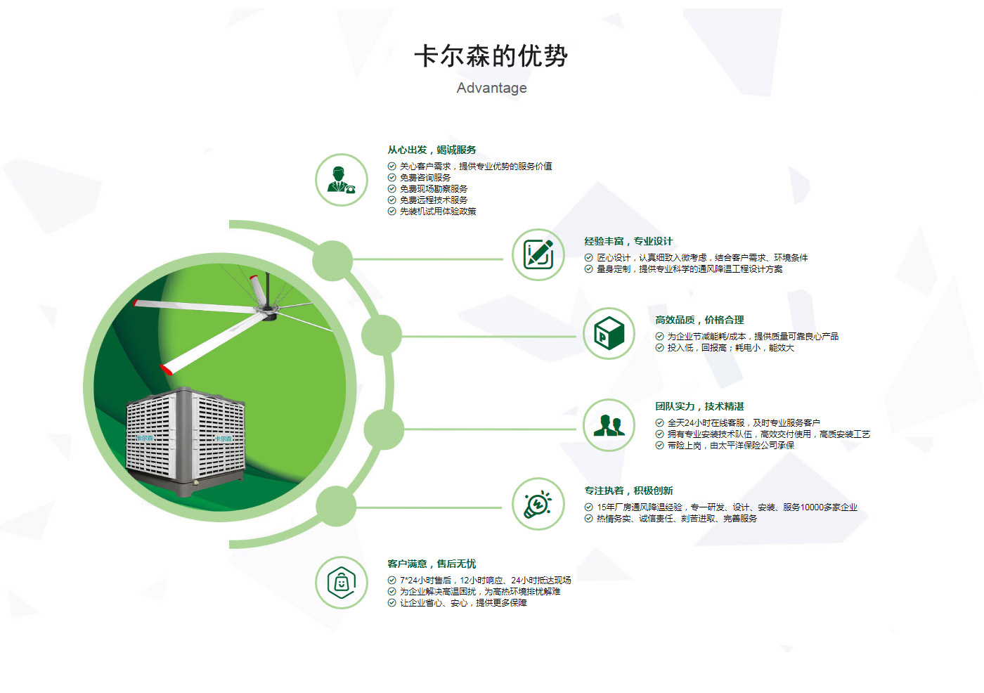 應用范圍: 適用于高溫或有異味的車間:熱處理廠、鑄件廠、塑料廠、鋁型材廠、制鞋廠、皮件廠、電鍍廠、印染廠等各種化工廠等。 適用于勞動密集型企業:服裝廠,各類裝配車間,網吧等。 適用于需要降溫又需要一定濕度的場所:棉紡廠、毛紡廠、麻紡廠、織布廠、化纖廠、經編廠、加彈廠、針織廠、絲織廠、襪廠等各類紡織廠。 適用于:倉儲物流領域、園藝溫室大棚通風降溫、畜牧場降溫等場所。 全國服務熱線:13960350919